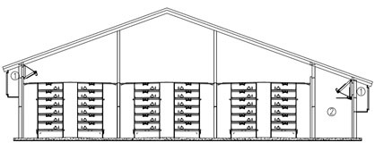 Ширина равна 15, 18, 21 и 24 м, высота 2,5-6 м, длина, как в первых двух вариантах. Конструкция полностью лишена выступающими частями. Это основано на внутреннем расположении стен и потолка. Полностью учитывается особенность поведения птиц, идеально подходит для выращивания и откорма птицы в особом напольном варианте содержания.